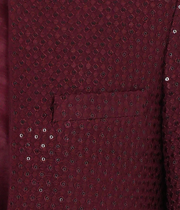 Maroon color Embroidered gone-style Prince Coat for men, featuring detailed embroidery and a tailored fit. The coat is made from an embroidered fabric and has a Maroon kurta with loop buttons. Explore this unique piece.