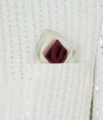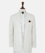 Embroidered gone-style Prince Coat for men, featuring detailed embroidery and a tailored fit. The coat is made from an embroidered fabric and has a white kurta with loop buttons. Explore this unique piece.