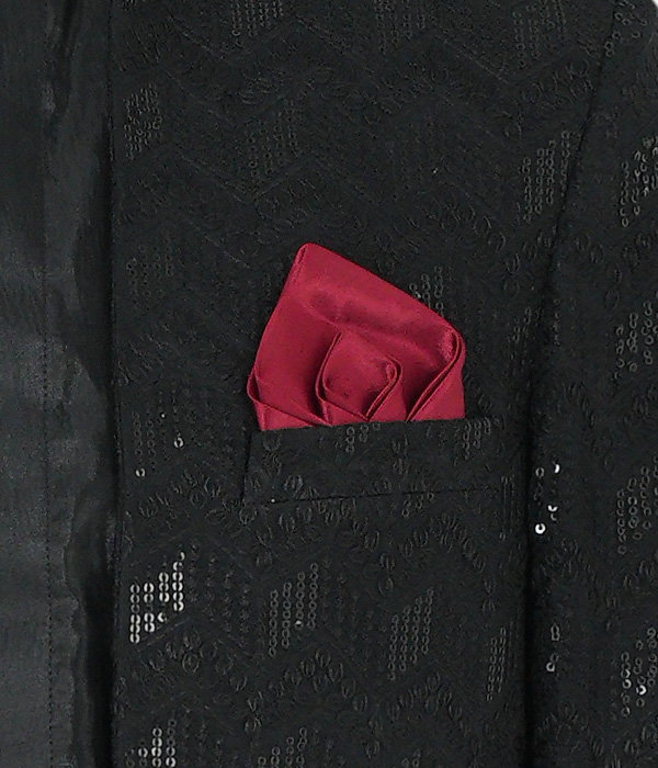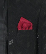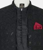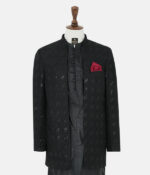 Black Embroidered gone-style Prince Coat for men, featuring detailed embroidery and a tailored fit. The coat is made from an embossed fabric with a geometric pattern and has a black kurta with loops buttons. Explore this unique piece.