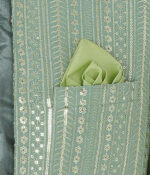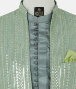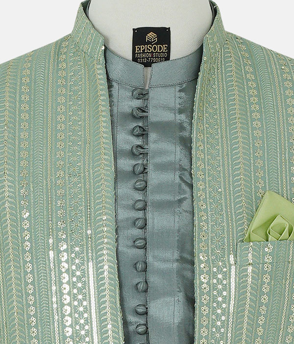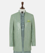 A light green embroidered gone-style Prince Coat for men features detailed embroidery and a tailored fit. The coat is made from an embroidered fabric and has a green kurta with loop buttons. Explore this unique piece.