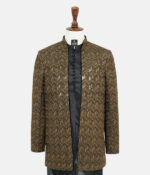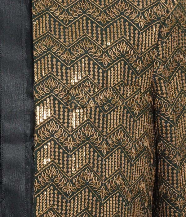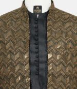 Copper Golden Embroidered gone-style Prince Coat for men, featuring detailed embroidery and a tailored fit. The coat is made from a fabric with a copper and gold geometric pattern and has a black kurta with buttons. Explore this unique piece.