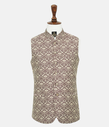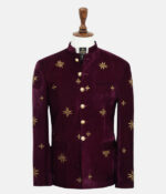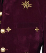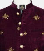 Features golden Brass buttons and dark Maroon micro-embellished velvet fabric with star-shaped. Explore this unique piece.